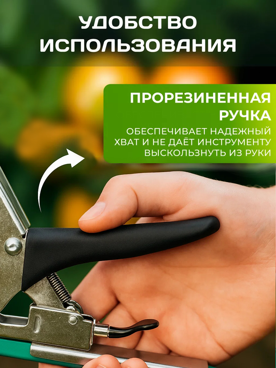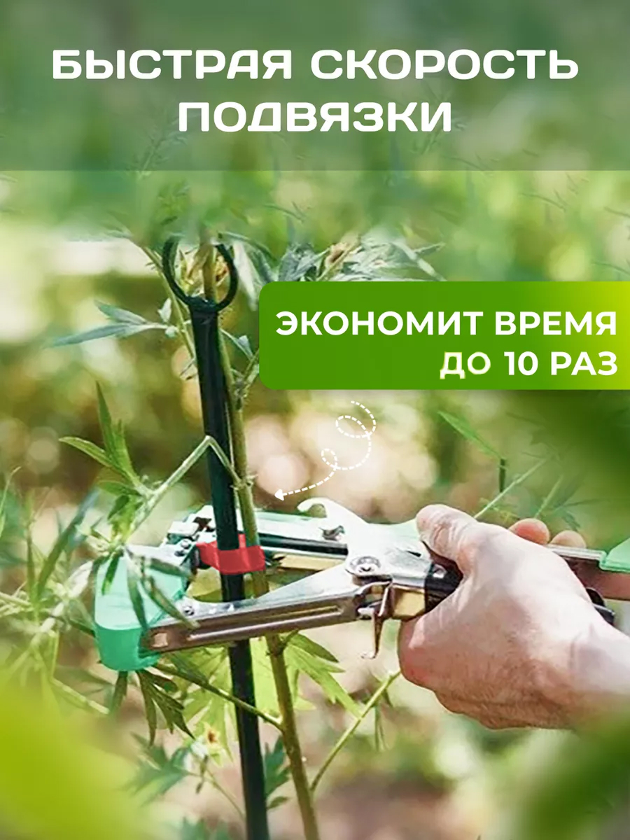 Обеспечивает быстрое и надёжное закрепление стеблей овощей, цветов, винограда и кустарников в саду, на грядке или в теплице, без лишних усилий и повреждений.