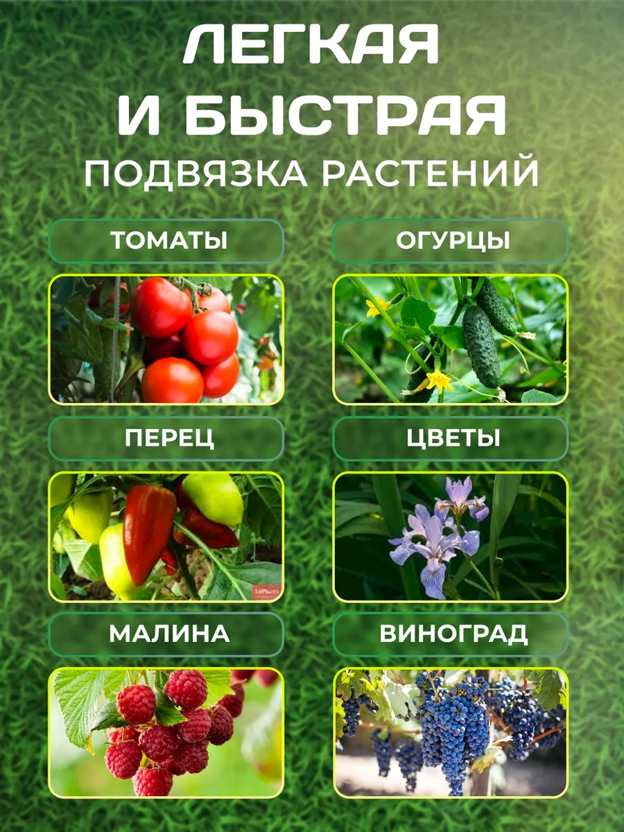 Обеспечивает быстрое и надёжное закрепление стеблей овощей, цветов, винограда и кустарников в саду, на грядке или в теплице, без лишних усилий и повреждений.
